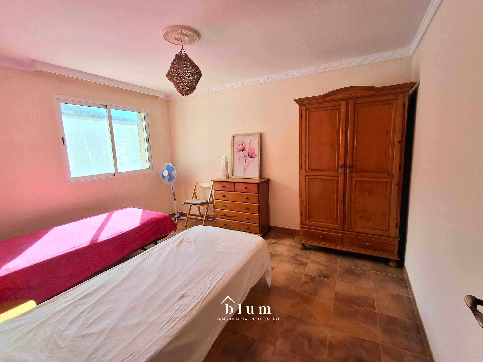 Let’s go to the main house. The entrance is through a beautiful blue metal door that leads to a garden area where you can also park. In the same area, on the left, we find the staircase that connects the two houses within the plot and a little further to the right and outside the house itself, we have storage space and there we find the water installation and, a little further to the right, we have the main door. At the entrance, there is a large open-plan living room and kitchen. The kitchen is fully equipped and has a gas hob. There is also a full bathroom with a bathtub and a master bedroom with a large built-in wardrobe, well laid out to maximise storage space. This house has a total of 69 m².