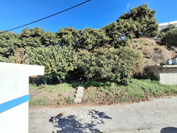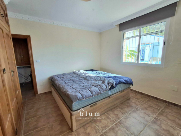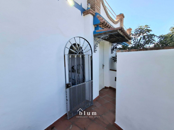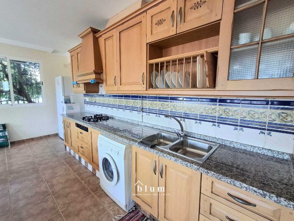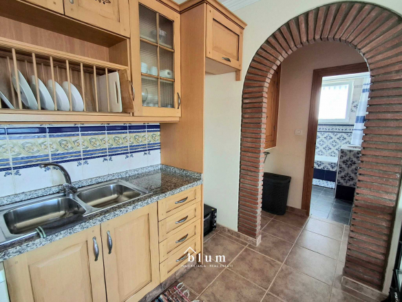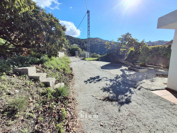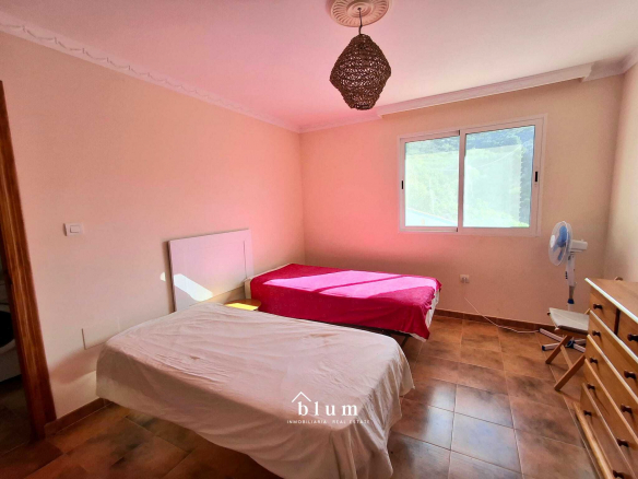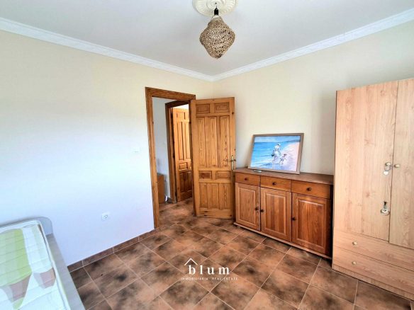 Let’s go to the main house. The entrance is through a beautiful blue metal door that leads to a garden area where you can also park. In the same area, on the left, we find the staircase that connects the two houses within the plot and a little further to the right and outside the house itself, we have storage space and there we find the water installation and, a little further to the right, we have the main door. At the entrance, there is a large open-plan living room and kitchen. The kitchen is fully equipped and has a gas hob. There is also a full bathroom with a bathtub and a master bedroom with a large built-in wardrobe, well laid out to maximise storage space. This house has a total of 69 m².
