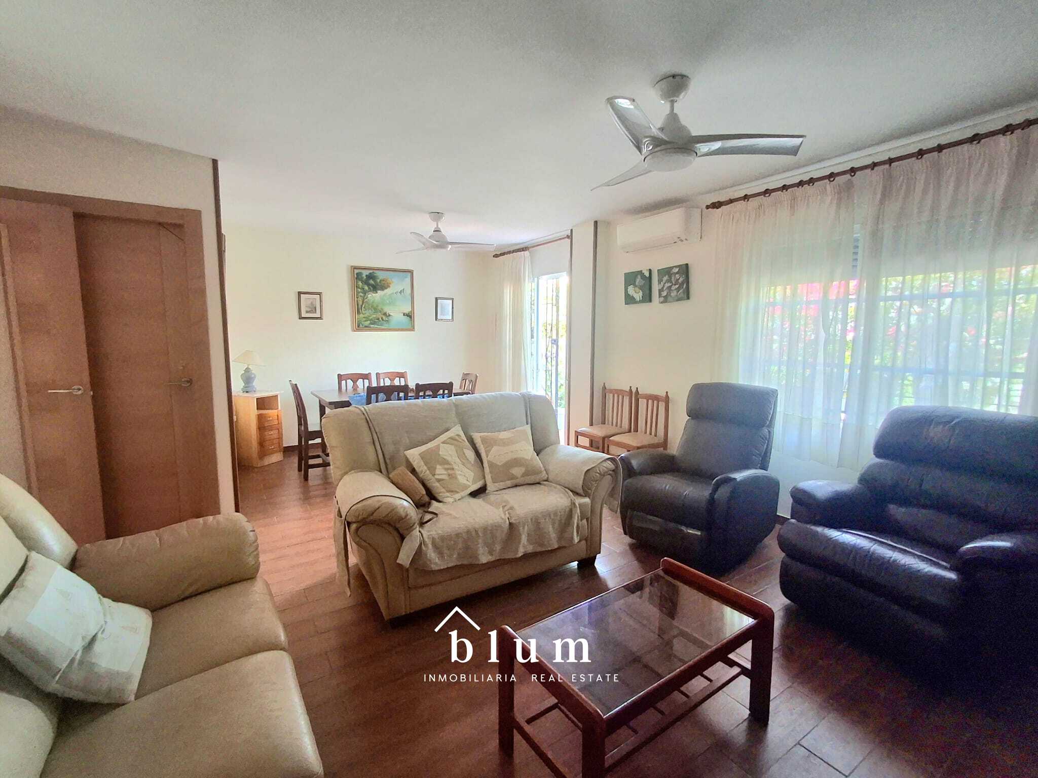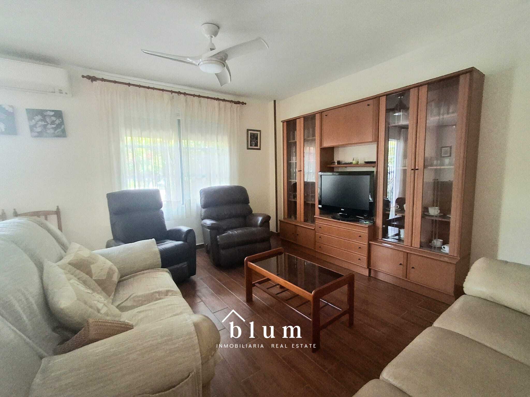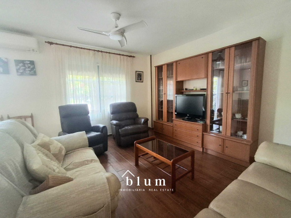La vivienda cuenta con un total de cinco dormitorios, uno de ellos en la planta baja, con acceso directo al cuarto de baño de esta planta, lo que lo hace perfecto para los mayores de la familia. En la misma planta encontramos una cocina completamente equipada, amplia y funcional, con cocina de gas, lavavajillas, menaje completo y una de las dos lavadoras de la propiedad. Desde la cocina se accede a un gran salón comedor, un espacio lleno de luz natural que invita a la convivencia y al descanso. La zona de estar, con cómodos sofás, se abre a una encantadora terraza-jardín donde el tiempo parece detenerse: una gran mesa al aire libre rodeada de plantas crea un ambiente perfecto para comidas en familia o tardes de esparcimiento