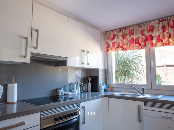 The large and luminous living-dining room opens onto several outdoor terraces, ideal for enjoying the region’s mild climate all year round. The master bedroom includes a private bathroom and a balcony with views, creating an intimate and relaxing atmosphere.